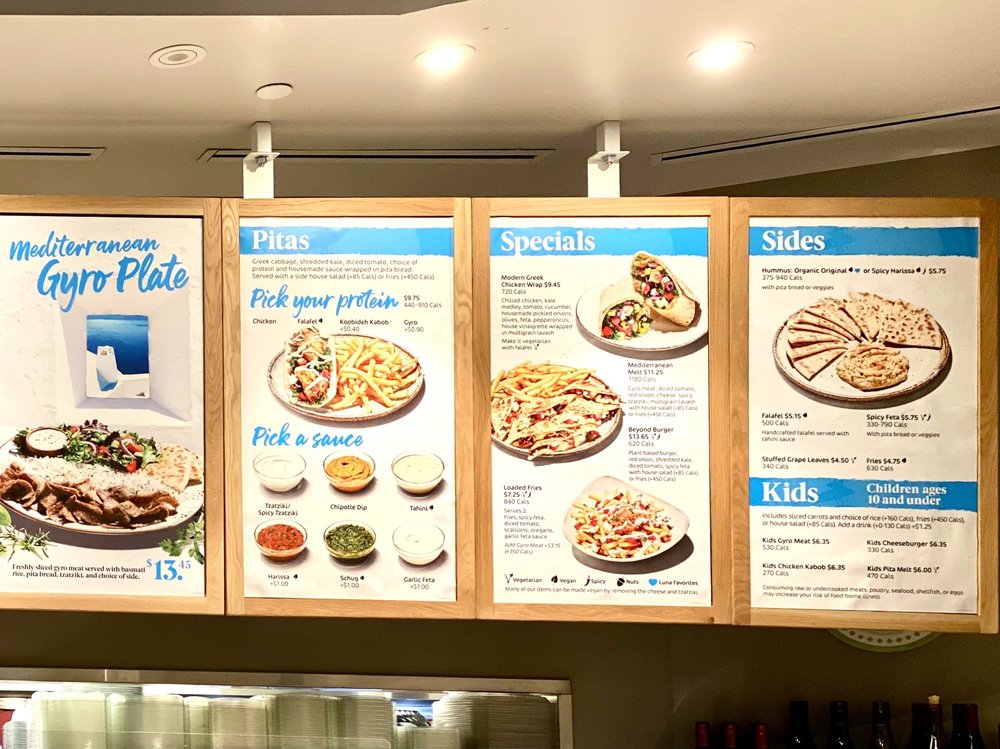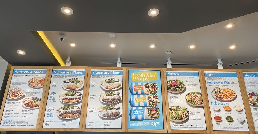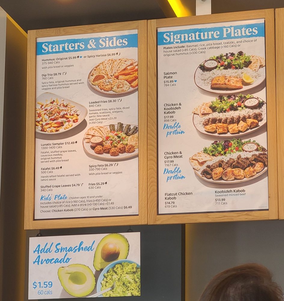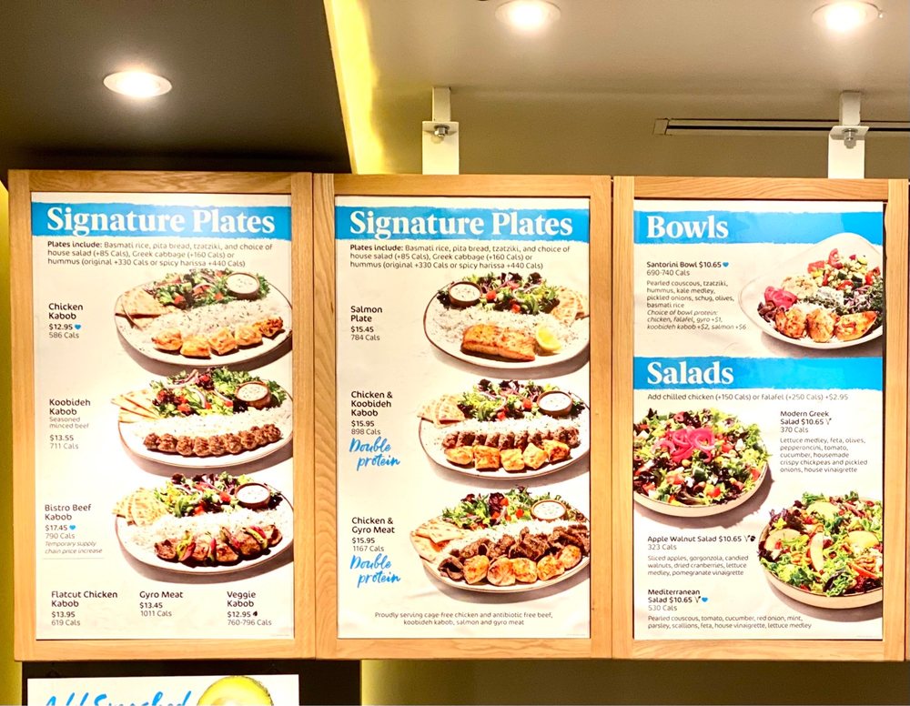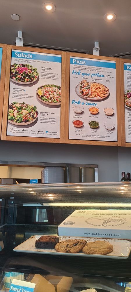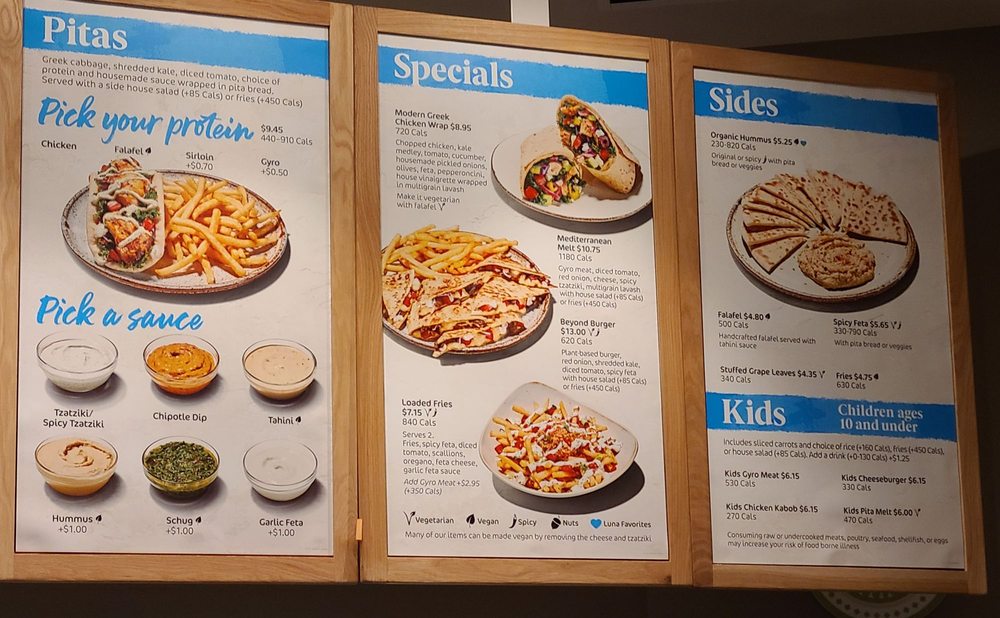 Sliced apple, crumbled gorgonzola, candied walnuts, dried cranberries, lettuce medley, pomegranate vinaigrette (340 Cals). Pita bread (+110 Cals). Add on chopped chicken (+130 Cals), falafel (+250 Cals), or gyro (+350 Cals)